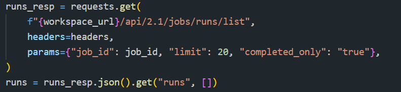 Job Runs List Endpoint - This is used to get execution history for a specific job API endpoint: /api/2.1/jobs/runs/list. I have asked it to retrieve the information for the last 20 runs of each job for all completed ones.
