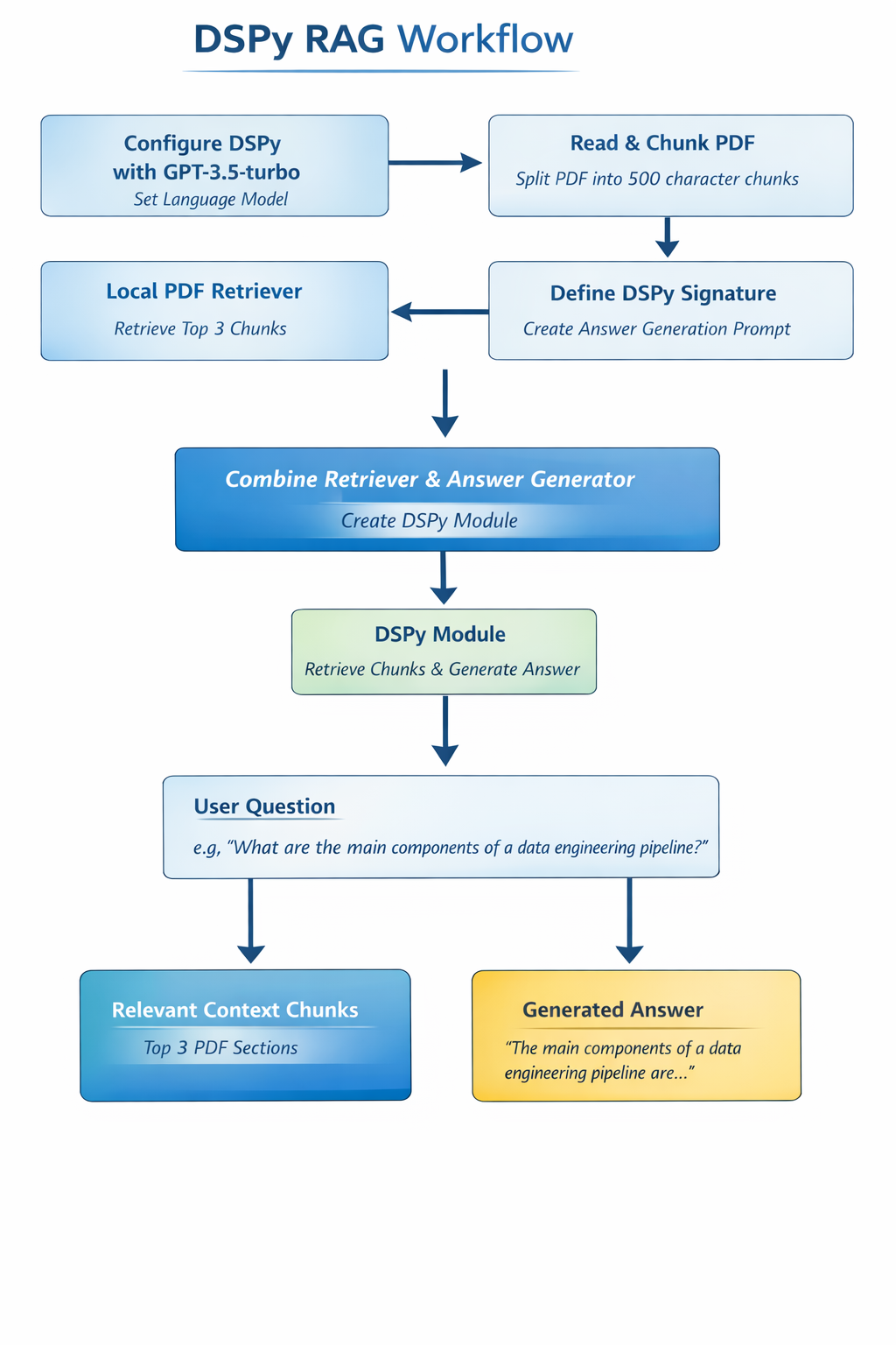 After that, I combined the retriever and the answer generator into a DSPy Module, allowing the system to take a question, retrieve the relevant chunks, and produce an answer in a single step. Finally, I asked questions about the PDF, such as “What are the main components of a data engineering pipeline?”, and the system returned both the most relevant context chunks and a short, factual answer.
