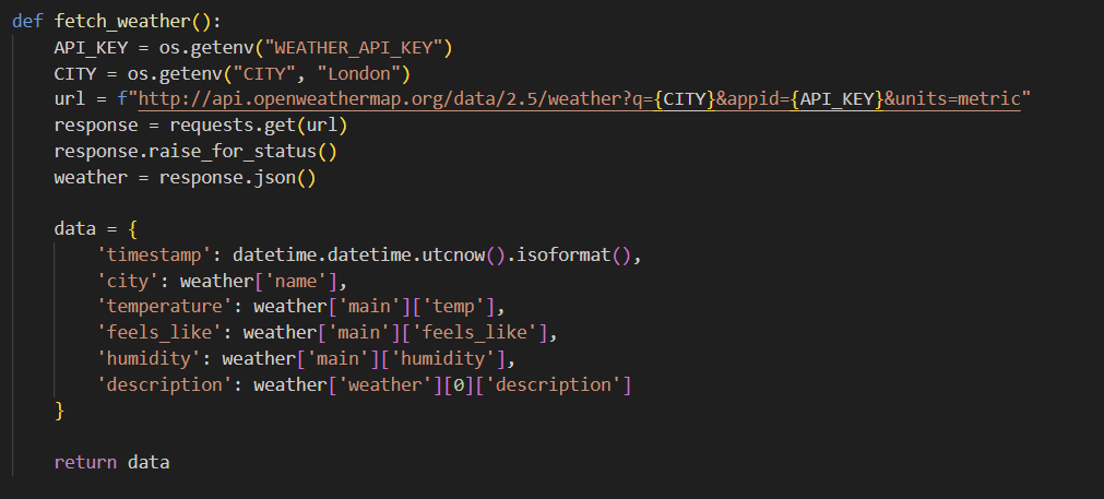 Imagine you’re building a dashboard that shows real-time weather updates. Maybe you want to analyze how temperature varies across cities, or trigger alerts when humidity hits extreme levels. To do that, you need a constant stream of fresh weather data and a place to store it for further processing.